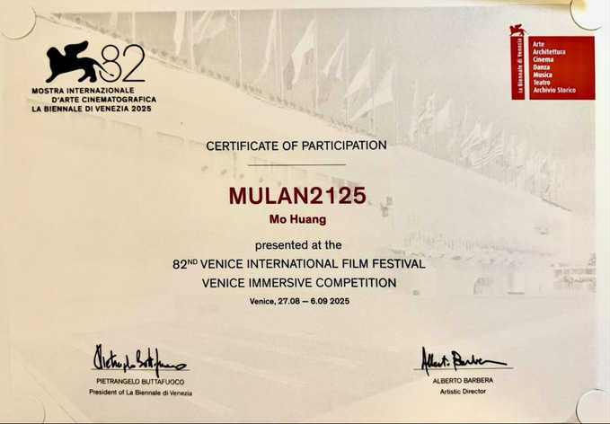 « MULAN 2125 », développé sur le dernier moteur UE5, exploite l’intelligence artificielle pour optimiser la production et offre une expérience audiovisuelle immersive comprenant un angle de vision à 180°, une image 4K monoculaire et un son Dolby Atmos. Le film a précédemment reçu le prix « Excellence en design visuel » lors des Prix du Tapir du Rêve d’Or 2025 (Golden Dream Tapir Awards 2025) et le prix d’Argent 2025 dans la catégorie « Œuvres de narration interactive en réalité virtuelle (VR) » des Prix du Dauphin d’Or 2025 (Golden Dolphin Awards 2025). Il a également été sélectionné pour la Compétition principale du programme « Venice Immersive » de la 82e Mostra de Venise, devenant ainsi la seule œuvre de cette édition réalisée entièrement par une équipe de Chine continentale.